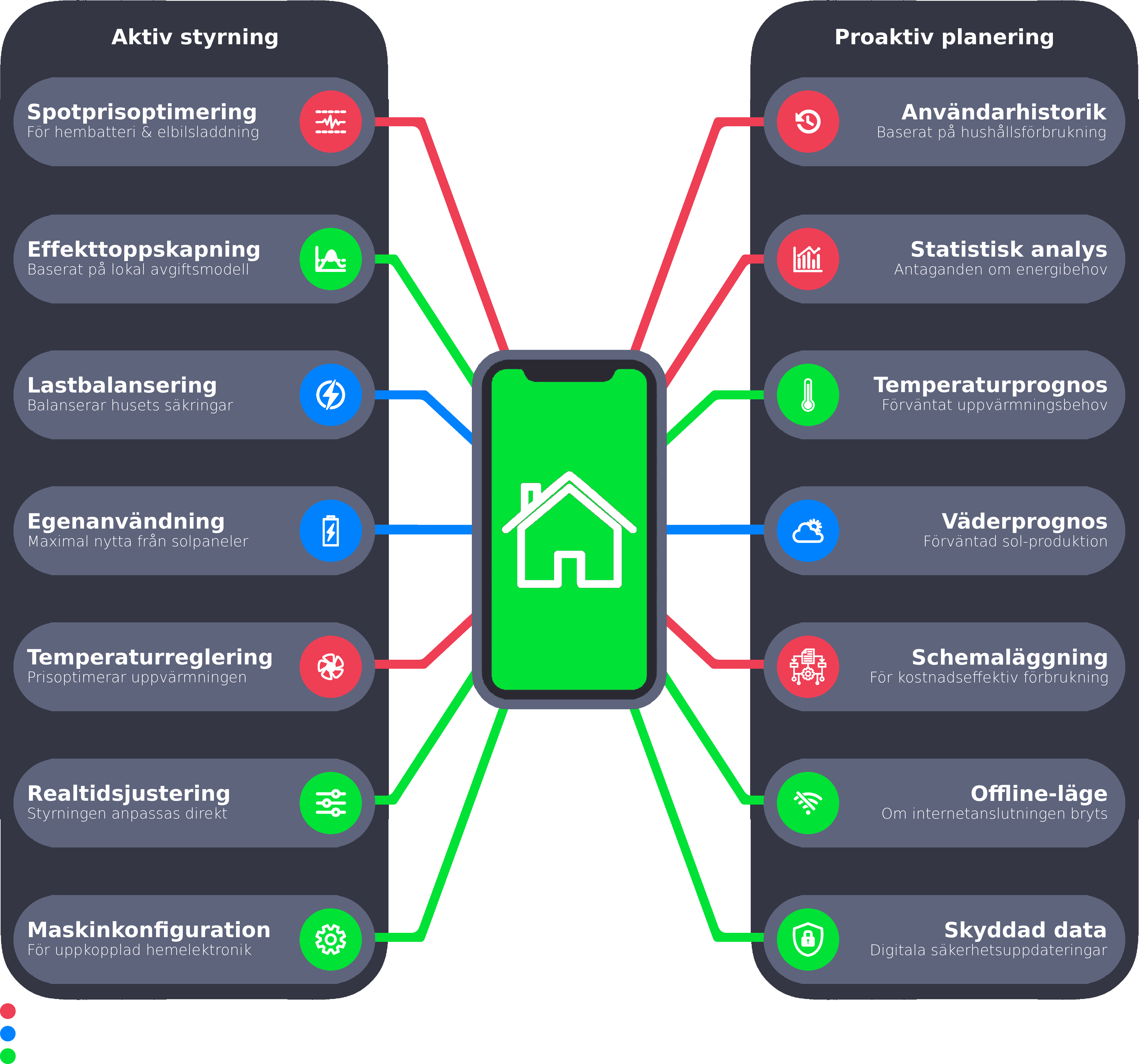 Realtidsjustering är en av de funktioner som skiljer Nordic Smart Home från alla andra system för smart energistyrning. Enkelt uttryckt innebär det att vår algoritm inte låser sig vid gårdagens planering – den anpassar styrningen ögonblickligen så fort verkligheten avviker från prognosen.